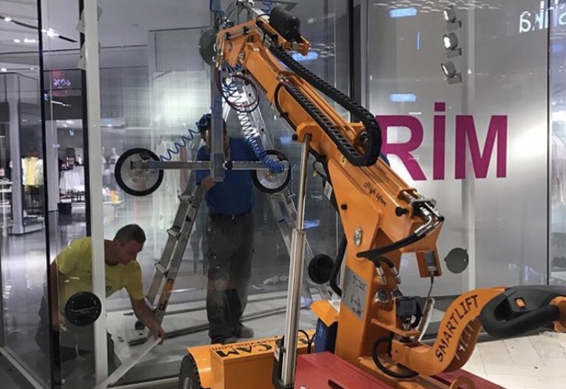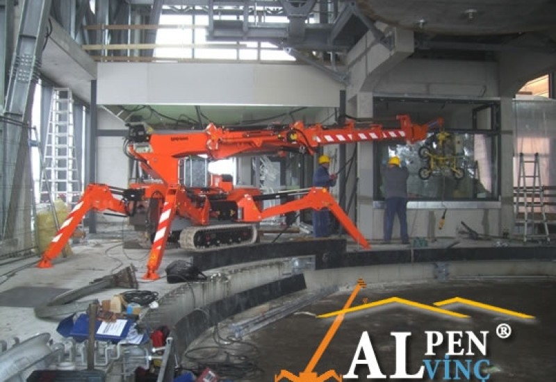Bazı iş merkezleri, iç cephe ve dış cephe cam giydirmelerine sahip yerlerde cam kırılmaları, yeni cam montajlaması yapılması gerektiğinde özel vakumlu başlığı ile örümcek vinç bu konuda muhteşem özelliklere sahiptir.